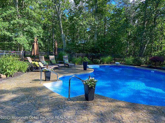This home has it all! Situated on a large, wooded lot with lush, mature landscaping and an in-ground sprinkler system. The private, park-like yard features a large stamped concrete patio, a paver firepit, a separately fenced in-ground pool, and a large shed. Located on a quiet cul-de-sac with no through traffic and close proximity to Patriot's Park and Justice Complex with sports fields, playgrounds, and a splash park! Great Adventure and the Jackson Premium Outlets are nearby! Don't miss out. Schedule a showing today!