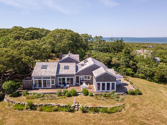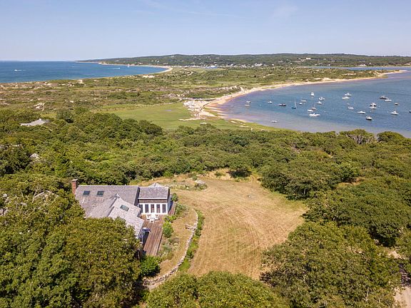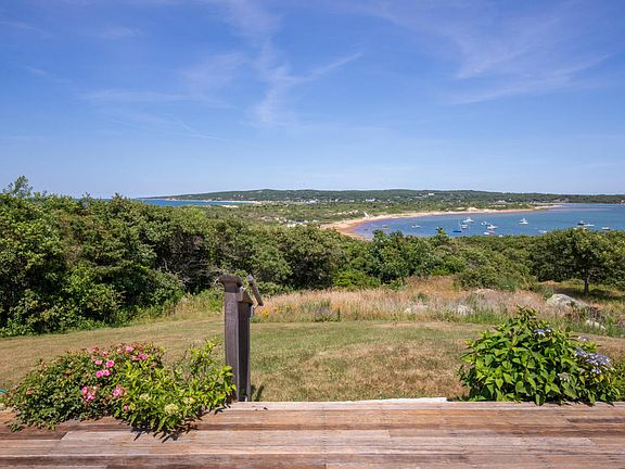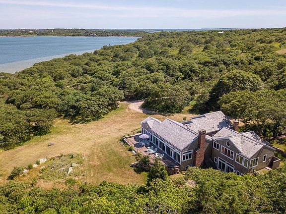 With +/- 300' of waterfront on Menemsha Pond and endless views of the Sound, Lobsterville beach, Menemsha and much more, this beautifully elevated home is truly a spectacular Aquinnah offering. Set nearly 100' above the pristine shores of the pond, a thoughtfully designed residence awaits with grand open spaces, generously proportioned bedrooms - including two master suites - and jaw-dropping views from nearly every corner of living space. Light pours in through sliding glass doors and oversize windows, and a level of ease is provided by soaring ceilings and a level of understated elegance. Outside the home, abundant lawn, landscape and hardscape gently lead one downhill to the waterfront, where recreational options abound.