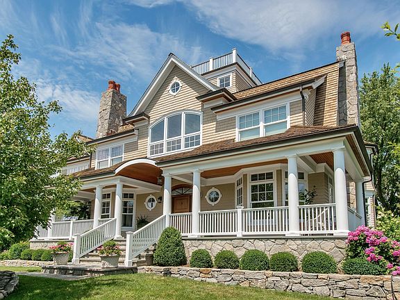 Perfect coastal home! Sun-filled house w/access to private beach & waterviews. Jog, walk, ride to Tod's Point-local treasure of trails, beaches, sailing & kayaking. Grand 2-story foyer leads to open kitchen, family room & breakfast nook w/bay windows & fireplace. Sliding door to stone patio. Mudroom w/ storage & 1/2 bath great for entering from a day at the beach. Eclectic dining room keeps this beach home casual. Library w/fireplace & built ins + 2nd powder room complete 1st floor. Large Master w/waterviews & cozy sitting area. 1 ensuite bedroom, 2 bedrooms sharing full bath & laundry room complete 2nd floor. 3rd floor has bonus space, cedar closet & loft area w/ sliding ladder to access the widow's walk. Lots of storage closets. Enjoy quiet time on the front rocking-chair porch. Stunning