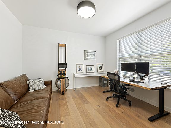 Kitchen features beautiful quartz countertops with a waterfall feature. Convenient first floor office. Wood floors, updated powder room off the garage and open and airy layout.