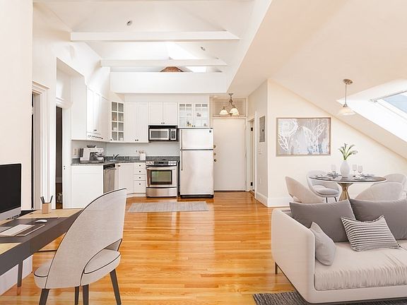 This sun-filled penthouse is not to be missed! Situated in a quintessential brownstone just steps from one of the Charles River footbridges, this 2-bedroom offers a desirable open kitchen/living layout, vaulted ceilings and an oversized skylight allowing for an abundance of natural light. Both bedrooms are well proportioned with closet space in each room. Additional features include full-size appliances in the kitchen (including dishwasher), washer/dryer in-unit, and a common patio for the building. Close proximity to the Commonwealth Avenue Mall, shops & restaurants on Newbury St, Star Market, Trader Joe's, and the T. No undergrads allowed.