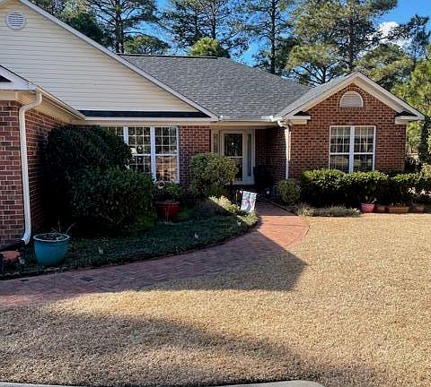 Relax! Golf-front living on a quiet, dead-end street in a low-maintenance house so you can go enjoy the lakes, playgrounds, and golfing in Whispering Pines. Open the screen door into the living room/dining room with vaulted ceilings, tile floor in the entry, new carpet in the living room and enjoy the fireplace on cold nights. Pristine white kitchen with granite countertops, island, 5 burner stove, stainless appliances, refrigerator included, pantry and additional seating area. Natural light through the large windows and the door to the newly-renovated screen porch with solar shades. Access to the screen porch from the main bedroom too. Split-bedroom plan. Also a large deck overlooking the golf course view. 2 car attached garage with attic storage. Roof 2015 (more photos tonight)