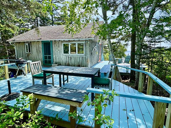 A quintessential island summer cottage! This charming 2-bedroom home captures the essence of island living, both inside and out. The large open concept kitchen, living room, and dining room enjoy south-facing views of Roberts Harbor, providing ample sunshine throughout the day. A lofted space above provides additional sleeping space for added convenience. Outside, a tiered wraparound deck with water views offers a picturesque setting for outdoor dining, entertaining, and relaxing.