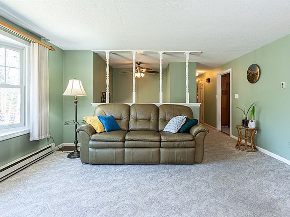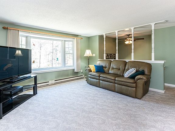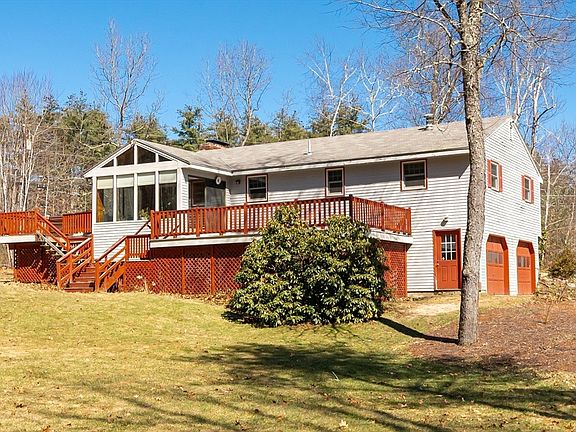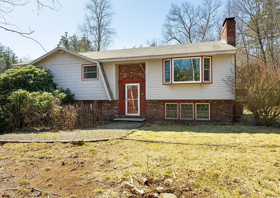 Welcome to Hollis and it's award winning schools. This wonderful and nicely priced home is ready for its new owners. The 3 bedroom, 2 bath home sits on 2.25 acres off a quiet cul-de-sac. The main floor flows nicely with an open concept living room/ dining room area with a beautiful brick fireplace. A heated sunroom can be enjoyed by entering through the dining room slider or through the eat in kitchen that has natural light and ample counter space. The primary bedroom has a large closet with direct entry to a full bathroom with long vanity and double sinks. A stackable washer/dryer is located in the bathroom closet with storage. Two more bedrooms can be found on the main floor. Lower level has much to offer with its extra large family room and 1/2 bath and utility room with extra storage .Direct access to garage. The yard has much to offer including a large out building that once was a dog kennel that used water and electricity and is ready to be converted to whatever you can imagine.