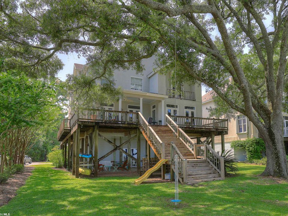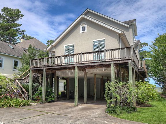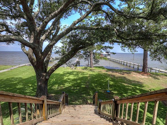 This raised cottage on Mobile Bay is a wonderful property with its close proximity to downtown Fairhope and stunning views. The wrap-around deck provides a great space to enjoy the breeze and entertain guests. The floorplan seems well-designed for hosting gatherings, with a formal living and dining room featuring beautiful wooden floors and vaulted ceilings. The open kitchen that connects to the great room, complete with a fireplace, adds to the charm and functionality of the home. On the main level, you'll find the primary bedroom and an adjacent office, offering convenience and privacy. Notably, there is a closet in the kitchen specifically designed to accommodate an elevator, which could be a valuable feature for accessibility. Upstairs is a small bonus room with a window unit A/C that can be used as a bunk room (perhaps for storage or as a flexible space) and a bathroom. Additionally, there are two bedrooms and a den measuring 9x12, providing additional living space or perhaps a media room. Finally, the property boasts a pier and a boat lift, allowing you to fully enjoy the bay sunsets and engage in water activities. This is truly a remarkable place to call home or use as the ultimate getaway, combining comfort, functionality, and breathtaking views.