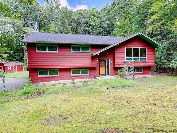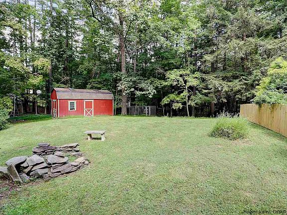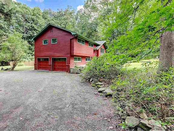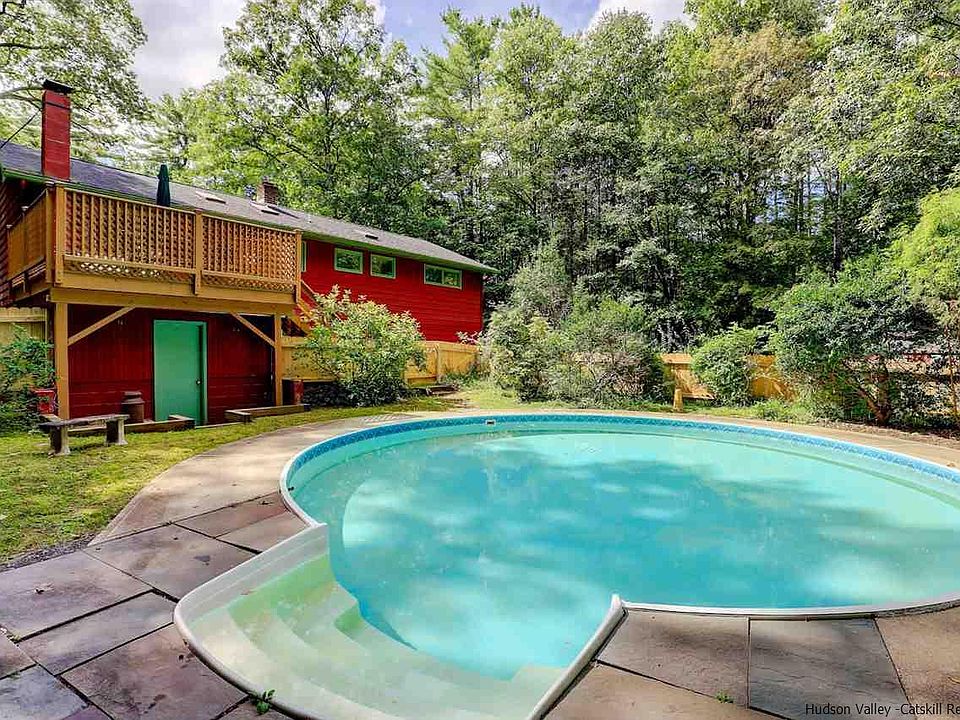 Located on a peaceful lane, this attractive raised ranch with three bedrooms and large downstairs family room features a lovely deck, circular in-ground pool AND a separate studio building with electric. In warm weather, enjoy taking a dip or relaxing on the deck before a nice meal overlooking the pool, lawn, and surrounding woods. In winter, gather downstairs for, what? -- music-making, board games, a favorite TV show? -- beside the warmth of a wood-stove. (Of course, a spacious family room/den is a plus any time of the year. Family room is currently being used as a music studio.) Natural light, hardwood floors, skylights, and ceiling fans add to the home's comfort and pleasure. Two-car garage includes room for a workshop. And don't forget the studio across the lawn, where you can paint or write or invent long into the evening.