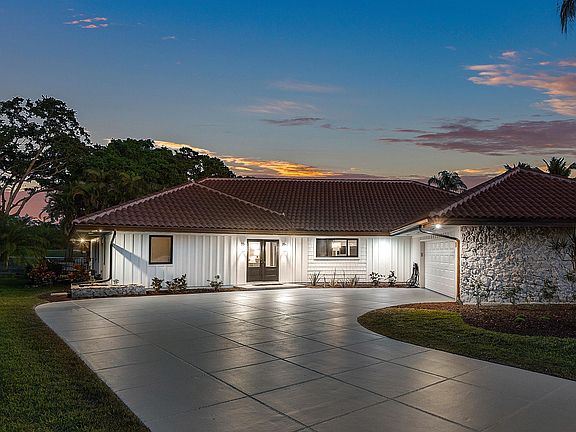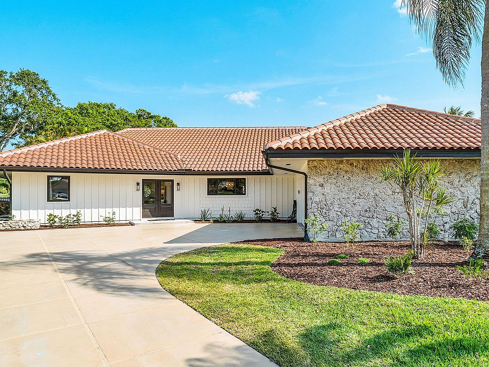 PGA National Trifecta - Golf course frontage, heated pool and fresh, total remodel! Expansive, set back views of both the Match course and serene water border this 1/3 acre property set in a quiet interior spot (beautiful Burwick location). Room-to-play yard and burgeoning butterfly garden frame the spacious Ivory travertine patio and newly refinished ''PebbleTec Petite'' pool featuring travertine coping and tile, autofill and new patio deco drain. Exterior 2022 upgrades continue with the cement S- tile roof, PGT Impact windows and doors (Therma-tru front door), new A/C trunk lines and vents, and new second 50 gal water heater. Inside, a new custom floor plan embraces the design details and finishes you've been searching for. Split floor-plan with cozy tucked away principal suite toward the west; three bedrooms, two full baths and flex/office to the east. Generous room sizes, including a Jack and Jill bath with 65 inch tub and dual, roomy sinks. Custom closets in all four bedrooms. Flex/home office (adjacent to full hall bath) with pocket glass doors provides privacy yet see-through family connection. Oak LVL flooring runs throughout, walls and ceilings accented by surprising custom shiplap accents. Warm white maple cabinetry, oak open shelving and Silestone quartz countertops highlight the massive kitchen. Professionally designed throughout with fun lighting and unexpected wallpaper finishes - a truly unique home.