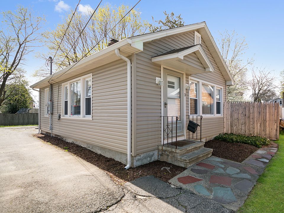 This cute condo alternative home within a beach community boasts a large lot and a one car garage. It has been recently renovated with new bathroom, refinished wood floors, new carpet and freshly painted interior. Private fenced in patio off kitchen for summer barbecues. Walking distance to private Bayview Beach with yearly association fee of only $170. There is a right of way for neighbor to garages---two are owned by neighbor. Fireplace does not function.