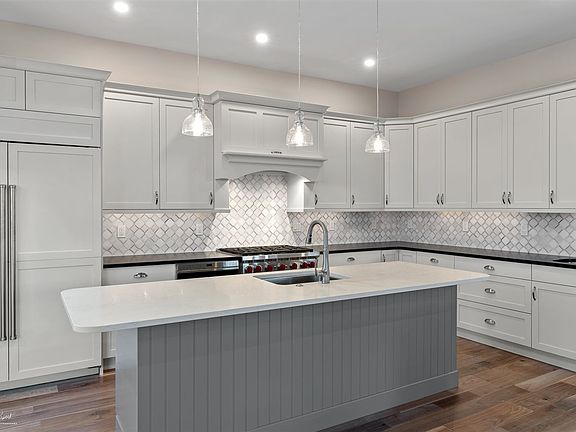 Beautiful new construction with water views from the front and back of the home! Designed by Don Zacker and custom built by W. J. Hand Builders this home has all the space, upgraded finishing touches and beauty your family is looking for. This 5 bedroom 5 bath home is also offered furnished by Complete Interiors. As you come through the front door the first thing you see are the fabulous vintage American walnut wood floors, over-sized baseboard and upgraded trim package. The first floor features 3 bedrooms, 3 baths, an entertainment room and laundry room. As you walk up to the second floor you will find the custom Water views and gourmet kitchen with 36" wolf range, side by side Sub Zero frig and freezer, Sharp drawer microwave, Cove dishwasher, Brookhaven cabinets with soft close drawers and doors, Absolute Black granite with a honed finish, tile accent backsplash, center island with sink and a Quartz Bianco Giola top. The second floor 10' ceilings allow for the over-sized 8' sliders which leads out to a wrap around deck which has a separate portion that is screened in. There is a breakfast nook, living room, gas fireplace, formal dining area and bedroom and full bath on this floor as well. The third floor is all Master retreat including bedroom with 9' ceilings, large walk in closet with custom built-in shelving, stackable washer and dryer, master bath with his and hers vanities, large walk in shower with rain head and body wand. The large 8' sliders again lead out to a wrap around porch to take in the water views and Sunsets. Some other features of the home are two tankless hot water heaters, 3 separate a/c and heat zones, Hardi plank siding, Trex decking, separate garage, red brick driveway, red brick surround on the foundation and sprinkler system. This home is truly a quality custom build with water and Sunset views that is ready for your family to enjoy.