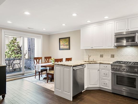 Nestled at the end of a private way, in a stately brick row house near John Harvard Mall, this beautiful 2BR/2BA duplex features soaring ceilings and a spectacular, newly renovated kitchen/dining area with glass sliders out to a private garden patio. The entry floor offers a spacious living room with a gas fireplace with mantel and sunny southern exposure. The primary bedroom features a custom closet and en-suite bath featuring a tiled shower with tub, storage closet, and a white pedestal sink. The lower level opens to a stunning chef’s kitchen w/white cabinetry, tiled back splash, high-end stainless appliances, gas cooking, and an elegant dining area w/heated flooring throughout. This area flows out to the private garden patio – perfect for entertaining. The second bedroom, currently used as an office/guest space, is serviced by a full BA w/ample cabinetry, tiled shower and white pedestal sink. Distinctions: C/Air, W/D, great proximity to town center, City Square Park and downtown.
