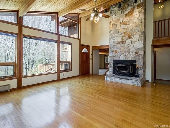 Spectacular contemporary cedar home, only steps (approx. 400') to the Columbia Lake Public Beach.Finished basement. Room for 3 cars-2 side by side, plus another in tandem, custom made cedar garage doors, plus an oversized custom cedar shed. This home features soaring cathedral ceilings, updated kitchen (granite counters), new appliances, central air on 1st floor and in wall units upstairs professional landscaping and stone walls, large composite deck, updated mechanicals, windows and roof. Security system and video system are included. Just move in and enjoy a summer on the lake, boating, fishing, swimming and entertaining. 15000w Generac automatic generator. Columbia high school options are EO Smith or Bolton HS.