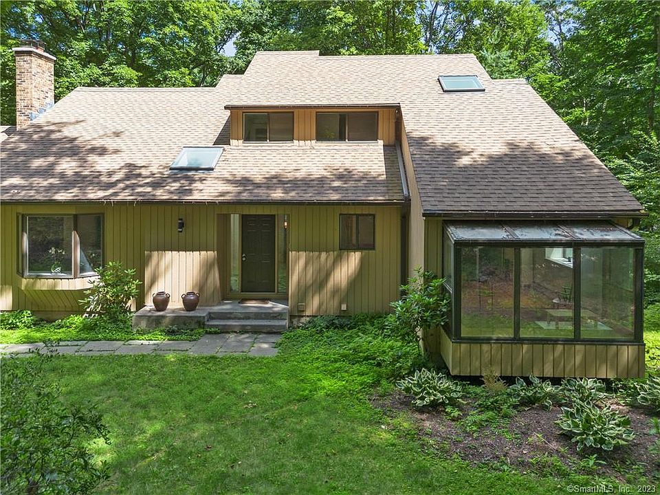 This unique contemporary boasting 4 bedrooms and 3.1 bathrooms, is nestled into a quiet cul-de-sac in the desirable High Hill subdivision. You’ll have easy access to a private walking trail, maintained by the HOA, which connects to the MDC trail and Heublein Tower. Additional trails also connect to Auer Farm. Back at the house, enjoy the outdoors in total privacy from the large deck - spanning the entire back side of the house - or the attached 3 season porch. Inside you'll find a generously sized open-concept living and dining room with a large fireplace and 2 story ceiling. Also on the main level, the master bedroom suite features sliders to the deck, a walk-in closet, a soaking tub and stand alone shower. The centrally located kitchen with eat-in space, a second bedroom/solarium as well as another full bath with laundry, round out the first floor. The second floor offers a large loft area with great potential for a home office that overlooks the living and dining room, as well as two more bedrooms - one with a private balcony - and the third full bath! The mostly-finished basement includes a walk-out gym space, half bath and plenty of storage. The possibilities are endless in this home. Move in and make it your own! Roof replaced in 2019, central air with newer condenser and a new industrial-size dehumidifier in basement.