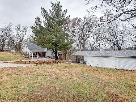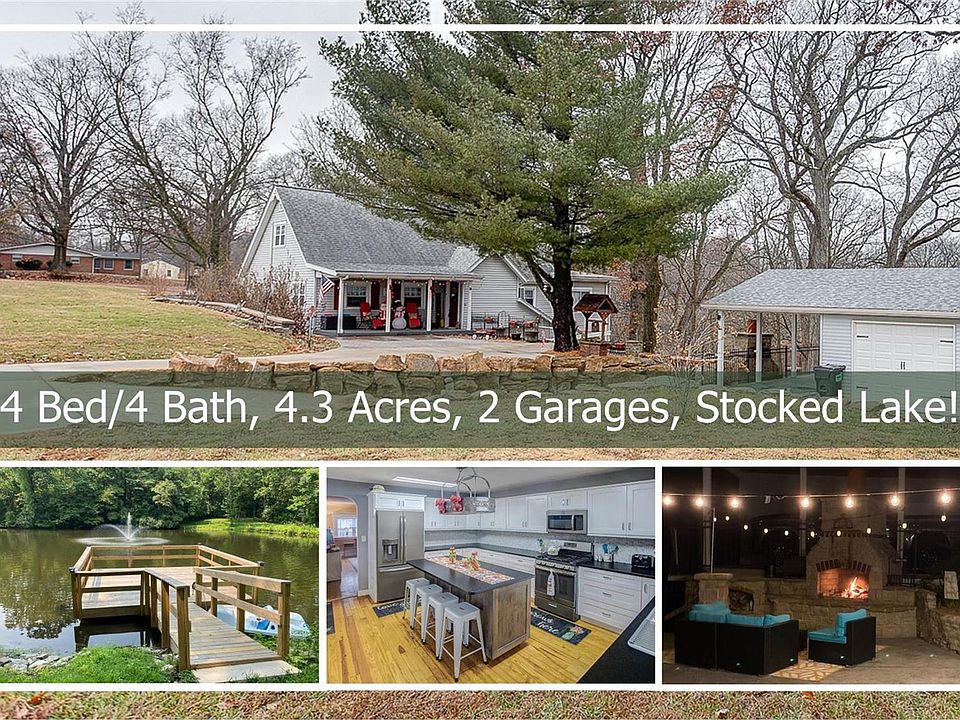 Private oasis on over 4 acres with a stocked lake! Spacious home with 4 bedrooms and 3.5 baths. Main level features a beautifully updated kitchen with white cabinets, large island, stainless appliances, granite countertops and tiled backsplash. Large dining room and living room with original wood floors. There is a primary bedroom suite on the main floor, along with another bedroom and full bath. Laundry on the main level, as well. Upstairs are 2 additional bedrooms, full bath and lots of storage space. The lower level is finished with a family room with wood burning stove, office, half bath and enclosed sun porch. Outdoors is a fabulous patio with built in bar and stone fireplace that overlooks the lake. The shared lake is over 25' deep and stocked with catfish and Koi. 16x16' dock is 3 years old. There are two detached garages, one built in 2017. Above ground pool can stay (purchased in 2022).