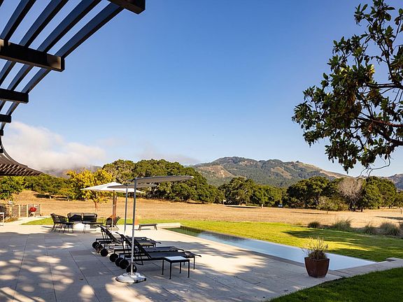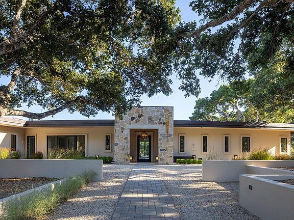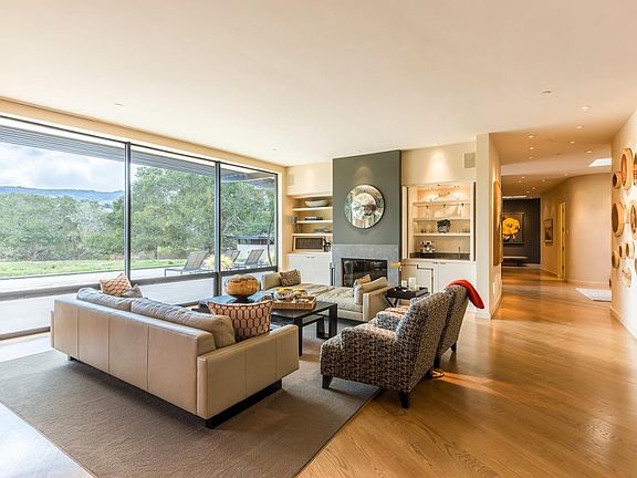 Life feels like art in this contemporary light-filled single-story home. The walls of windows and open floor plan provide easy access to an expansive poolside patio ideal for seamless indoor-outdoor entertaining and relaxation. Additional amenities include a chef's kitchen with modern palate and finishes, center island with breakfast bar and eat-in area dining option, luxurious primary bedroom retreat with gas fireplace, private patio and large walk-in closet, formal dining room, separate family/media room, Lutron lighting system, surround sound, and multi-zoned radiant heat throughout. Enjoy absorbing panoramic views of the Santa Lucia mountains and legacy oaks from the infinity pool at this elegant contemporary retreat. A detached three-car garage, horse barn and dog kennel provide shelter for autos and pets. Great location near the Preserve's front gate and clubhouse amenities creates an atmosphere of easily accessible seclusion beyond the fog in a nature-rich environment.