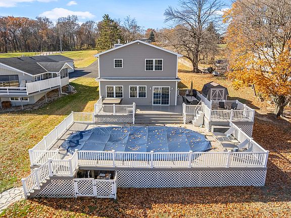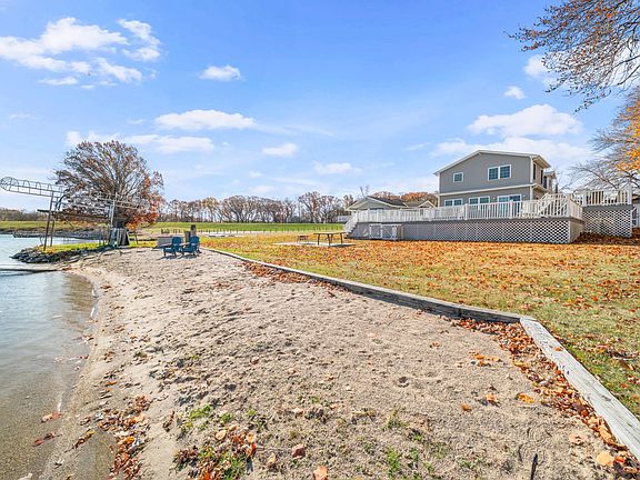 3 Holiday Drive located on the Somonauk side of the sought after recreational lake community of Lake Holiday is the rare combination of a gorgeously updated, move-in ready home with a desirable flat lot featuring a sprawling, private, walk-in sandy beach near the deepest part of the lake! Your new lake home will be THE hub for all Summer parties, and be a joy to host in all year round as the lake views are the star of the show from every angle of the main living space, AND the primary suite! A massive addition was added to the original structure in 2015 and the improvements have not stopped since! Featuring 4 bedrooms, incl. a 1st floor bedroom, 3 full bathrooms, approx 2,400sf of living space, and an outdoor entertaining paradise anchored by an oversized composite deck w/ multiple levels, a partially above ground, heated, 18x33 low maintenance pool, a BRAND NEW hot tub to enjoy this winter, 2 floating pier systems + boat lift, plus a nearly 80ft wide sandy beach! Now, let's explore the breath taking interior - entering through the 1st floor mudroom/laundry room (ideal for coming in off the lake!), you'll then round the corner to the 1st floor bedroom and nearby full bathroom, and then you'll take in the STUNNING view of the well appointed kitchen, dining area, and living room all facing the lake w/ water views in EVERY window! The custom kitchen showcases beautiful soft close cabinetry, granite countertops, SS appliances, a generous pantry, an island with seating, as well as a 2 tier breakfast bar, and tasteful lighting & fixtures. The fireside dining space has ample room for dinner parties or game nights alike! The lake facing living room is where you'll want to kick back and relax to take in the incredible water views, and maybe you'll even be lucky enough to catch a glimpse of the bald eagles that frequent this end of the lake! Heading upstairs, you'll first arrive at the lake view primary suite that's both spacious and airy with a walk-in closet, and en suite bath feat. double vanities and a walk-in shower. Two additional guest bedrooms and a nearby full guest bath complete the upstairs! The detached 2+ car garage w/ 8ft+ doors to accommodate boat storage was added a few years after the main house addition, along with the composite deck & pool, and A BRAND NEW driveway was added this year (2025). Other highlights include; power by the lake, a storage shed for lake toys, custom roller shades throughout incl. black out shades in the primary suite, 3 separate entrances to ample crawl space storage both interior and under the deck, tons of perks w/ the pool equipment including 2 solar powered vacuums, a basketball & volleyball net, a plumbed in gas grill, & so much more! All furnishings negotiable, too! 3 Holiday Drive is truly one of a kind, and a phenomenal opportunity to experience what it's like to "Be On Vacation Every Day of the Year!"