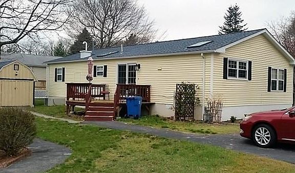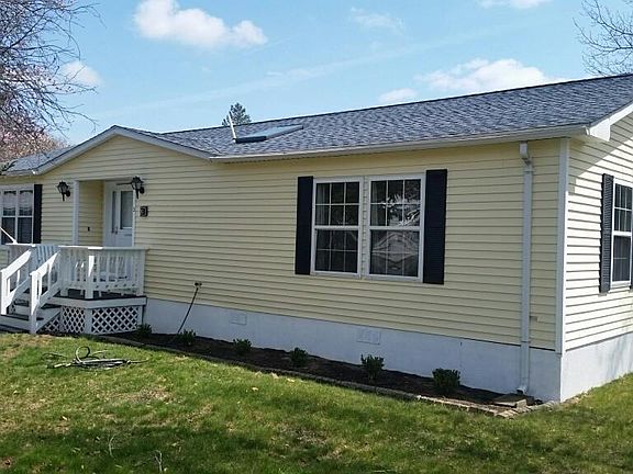 Open House Sunday Apr. 23rd 12-2**********Comfortable double wide manufactured home on corner lot. Double driveway, Deck has new deck boards and stairs, (deck skirting to be installed) Bright white skylit kitchen with gas cooking and new windows and screens. Dining area with newer sliding glass door opens to deck. Cathedral ceiling and new front window and screens in spacious LR. Master Bedroom has a full bath and walk-in closet. New Navien high efficiency gas boiler/water heater. 50yr roof and 3 skylights replaced in 2012. Full size washer and dryer, 2 story shed with newer roof.. Lovely landscaping.HOA fee of $613.64 includes trash removal, landscaping and snow removal of common areas, real estate taxes,clubhouse, pool, courtesy van(10 mile radius),security*** Owner is responsible for water,sewer and utilities..
