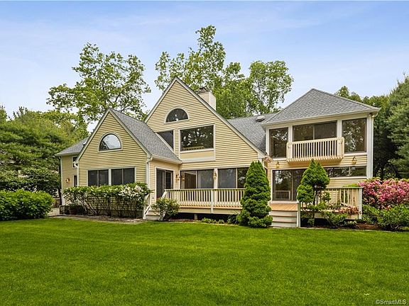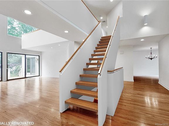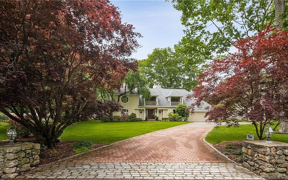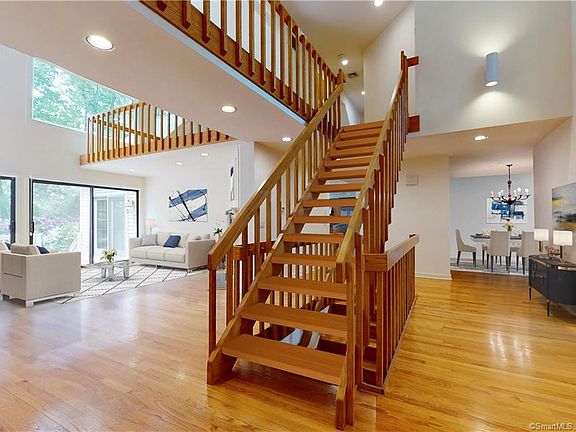 Located on a private cul-de-sac tucked along the Saugatuck River, this contemporary beauty is a walk, roll or stroll to everything that makes Westport fabulous - Beach, Library, Levitt Pavilion, Farmers Market, Restaurants, Shopping, Train, Saugatuck and Downtown. Offering clean lines and striking style, this custom-built one-owner home designed by architect Roger Bartels combines simplicity and function. Expansive walls of glass, an open flowing floor plan with interior space married to the exterior landscape are hallmarks of this stylish property. This sprawling sun filled home includes luxurious upgrades, soaring ceilings, and two primary suites - one on the main floor. The floorplan was designed to be extremely flexible and can change as needed. Updates include a handsome kitchen with a large center island, granite counters, stainless appliances and beverage station/wet bar. Additional recent upgrades include a half bath, full bath, Garage Tek system, oversized walk-in cedar closet, gutter guards, and more. Professionally landscaped with irrigation system, mature plantings, waterfall, and Koi pond. Year-round partial water views from the upper level and in the winter the main level also enjoys partial views. Don't miss the 3D tour
