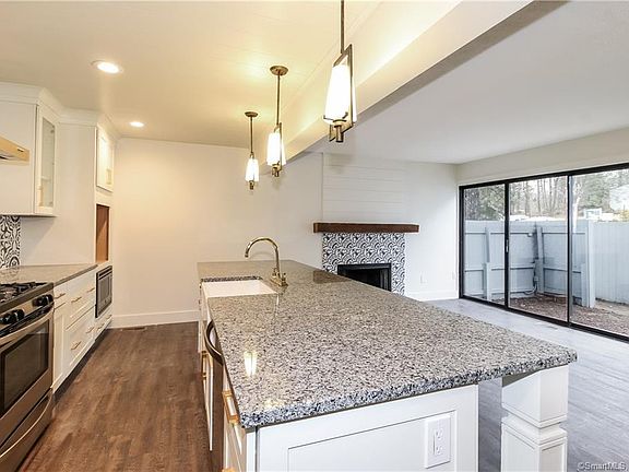 STUNNING lower 2 bedroom/1.5 bath unit COMPLETELY RENOVATED FOR MODERN LIVING. Brand new open kitchen with oversized island/breakfast bar, stainless appliances, granite counters, apron sink, cubbies and all new cabinetry. Kitchen opens to the family room with fireplace and slider door to fenced in patio area. Updated bathrooms with beautiful vanities, tiled tub/shower and tiled floors. Durable "wood-look" laminate flooring throughout. Two generously-sized bedrooms with two large closets in each. New doors throughout. Everything you could want including in unit laundry and extra storage close by. Assigned parking space #125 with guest parking close by. Recreation amenities of Fox Hill across the street and close to all that Ridgefield has to offer. ACT FAST ... THIS ONE ISN'T GOING TO LAST.