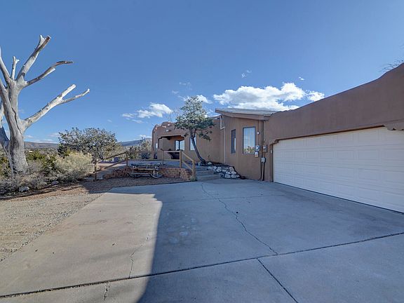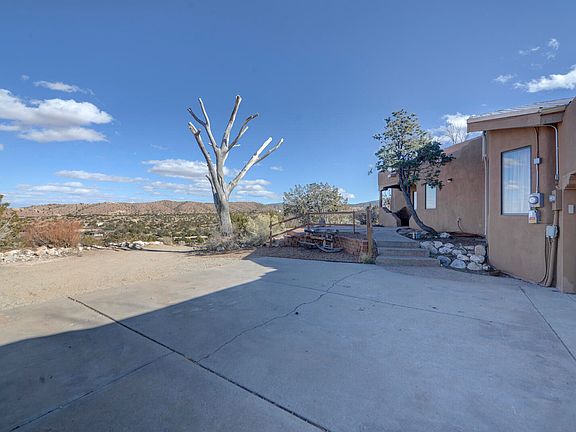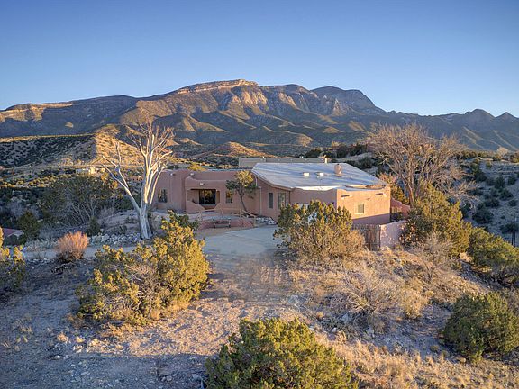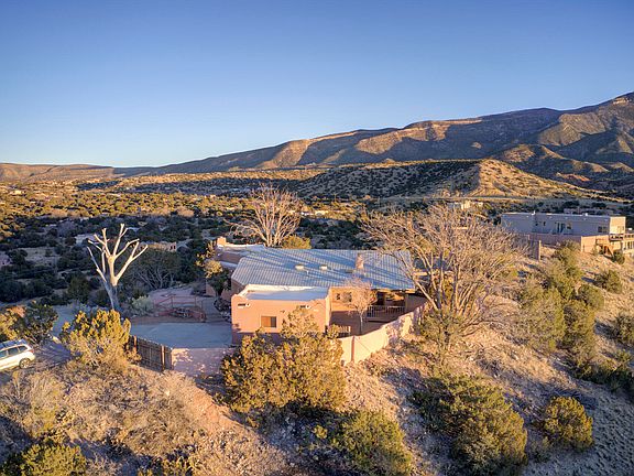 Phenomenal Mountain & Mesa Views from Private Ridge Top Home! Stunning Santa Fe Style Retreat Offers Timeless Charm! Over 85k In UPGRADES & Improvements! Gorgeous Brick Floors/Adobe Walls & Custom Kiva Fireplace Create an Inviting Living Space! Hand Carved Vigas/T&G ceilings! Gorgeous Updated Kitchen features Granite Counters/Custom Cabinets/Santa Fe Tile/Dining Island! Spacious Owner's Suite boasts a private covered patio/Walk-in Closet/Luxurious Bath with Custom Sinks & Tub/shower! Fresh carpet! Study or 3rd BR has built-in bookshelves! Usable land offers a perfect mix of trees & open space! Serene Haven where Southwestern Charm meets Comfort & Modern Amenities! Ideally located 5 miles off of I-25 between Santa Fe and ABQ! Solar Panels are owned! Prized San Miguel de Allende lights!