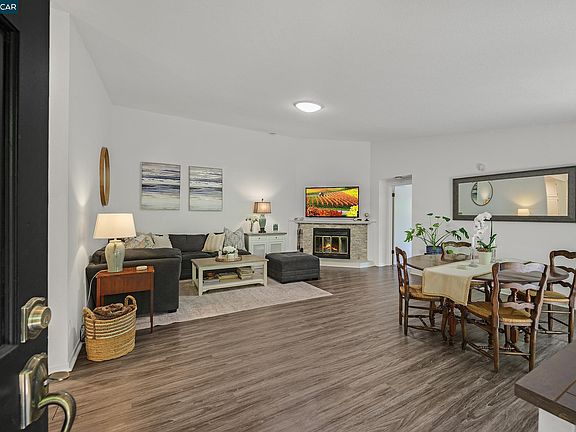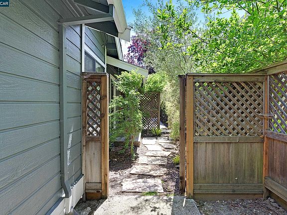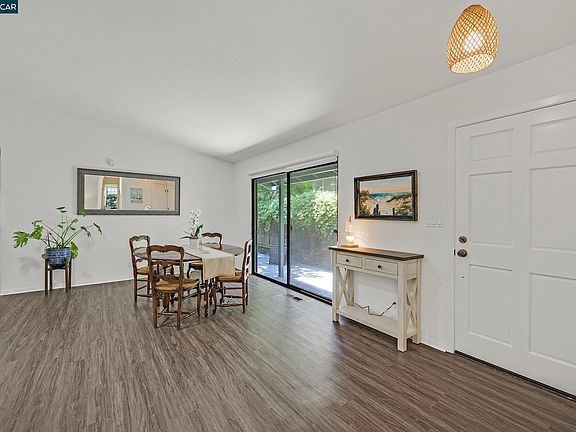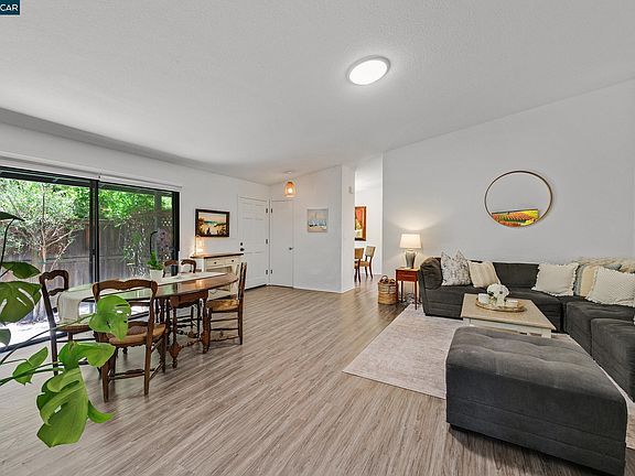Charming single-level townhome nestled in the sought-after Carroll Ranch community. This 2-bedroom, 2-bath gem features an airy open layout with soaring ceilings and a cozy wood-burning fireplace anchoring the spacious great room. The updated kitchen is a standout, showcasing sleek marble counters, stainless steel appliances, and a bright breakfast nook perfect for casual dining. The primary suite is thoughtfully positioned for privacy and includes a renovated ensuite bath, custom closet built-ins, and direct access to a tranquil backyard retreat. A second bedroom sits adjacent to a modernized hall bath, ideal for guests or a home office. Step outside to a beautifully landscaped Catalina Grana paver patio—perfect for entertaining, unwinding, or cultivating your garden. Enjoy the convenience of an attached one-car garage with interior entry, plus a community pool just steps away. Experience all that Moraga has to offer, from farmers markets and scenic trails to top-rated schools, local parks, and vibrant neighborhood amenities.