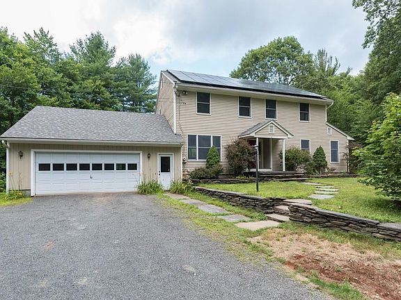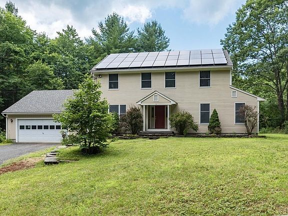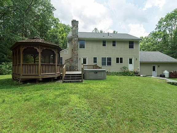 Private Williamsburg location for this handsome, clean-lined 2158 sq. ft Colonial home. Set on almost 2.5 acres on a quiet dead-end street, with 4 bedrooms and 2.5 baths, this well-built 1990 house has been updated with solar panels (owned), a back-up generator, new hardwood floors on the 2nd floor, and a deck with a hot tub and picturesque gazebo.The living room boasts an attractive Goshen stone fireplace, and features extra long windows, hardwood floors and flows into the kitchen. From the garage, there is immediate access into the mud room/pantry and first floor laundry. Solid wood 6-panel doors throughout, Anderson windows, natural wood trim, eat-in-kitchen, master bedroom suite with private bath. Ample closet space in all the rooms. The over-sized two car garage provides direct access to the very usable basement with high ceilings. High speed internet available. Ready for immediate occupancy! Why would you ever need to leave home?
