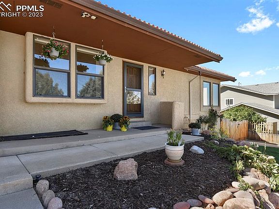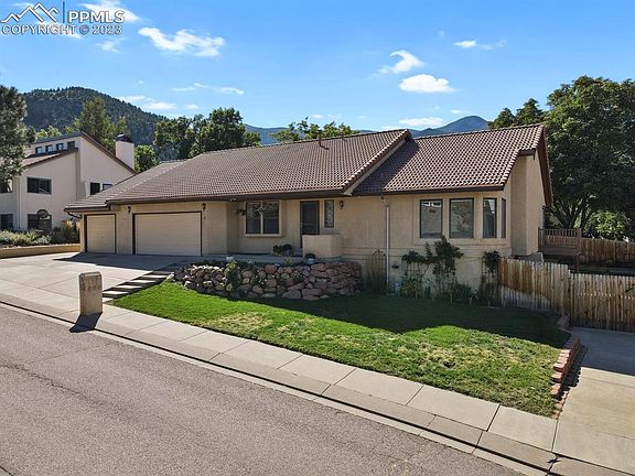 Enjoy sitting on your front porch while watching the sunrise on Garden of the Gods. This well-maintained home located in Manitou Springs' desirable Crystal Hills neighborhood features open concept living with vaulted ceilings, spacious family room featuring a gas fireplace, powder room, formal dining room adjacent to the sunken living room presenting a perfect layout for entertaining. The kitchen is equipped with solid surface Corian counters and a large peninsula island perfect for casual dining. Opening off the kitchen, is a walk-out sunroom and main floor laundry. The private primary suite is found alone on the main level with a balcony, en-suite bathroom, and spacious closet. The finished walk-out basement offers an additional family room or flex space, bathroom, storage and three bedrooms. These additional bedrooms are equally inviting and spacious. The backyard oasis is fully fenced for carefree leisure of kids and pets and boasts space for RV Parking on the side of the home in addition to a 3-car garage. Beautiful interior design details paired with red tile roofing and stucco exterior is ideal for low maintenance living. Access to endless hiking trails and open spaces right out your front door; a stone's throw from Red Rock Canyon Open Space, Garden of the Gods, Pikes Peak, and many shops, restaurants, and galleries in Manitou and Old Colorado City.