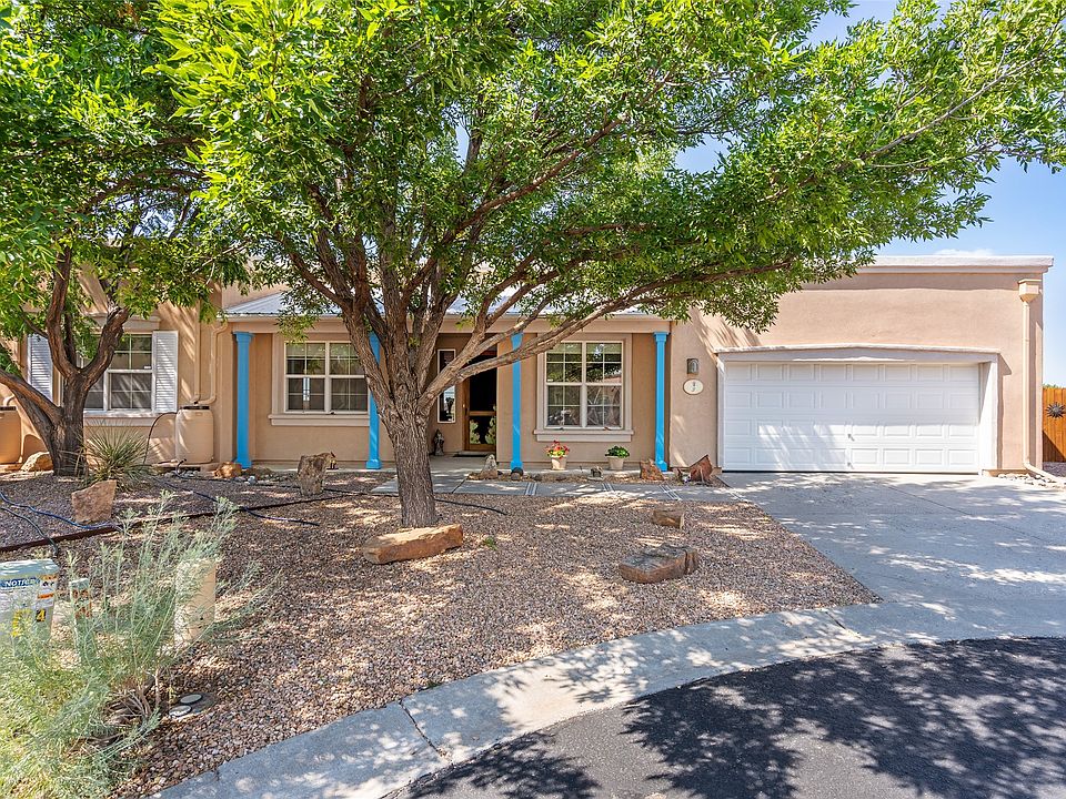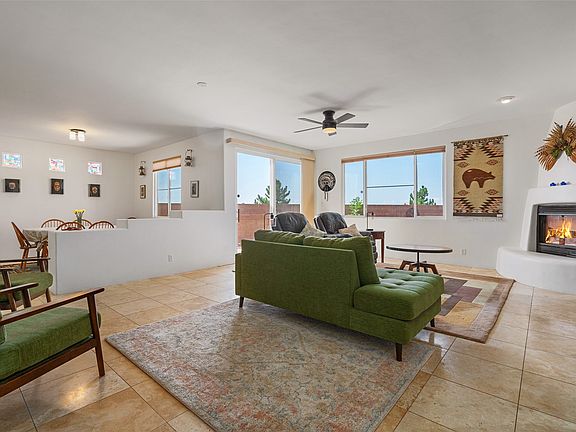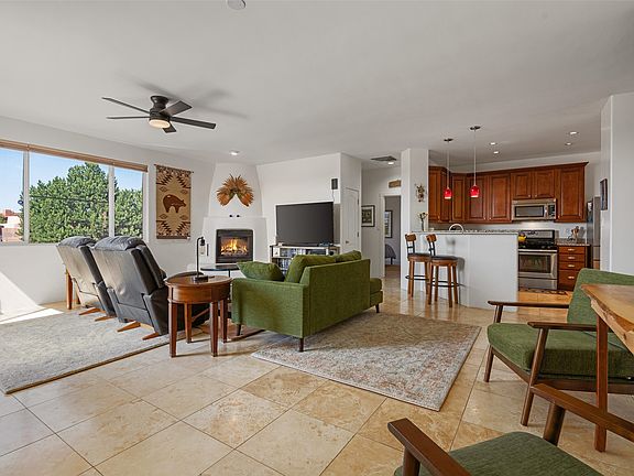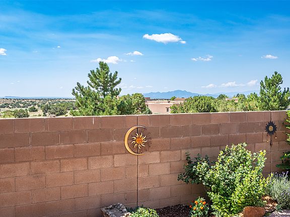 Views and Privacy? You can have it all!! This beautifully upgraded single-level home enjoys a prime setting that backs to open space, with estate lots across the way and sweeping views of two mountain ranges right from your backyard. Step inside to find sun-filled living spaces with travertine tile flooring, a charming gas kiva fireplace, and sun shades that soften the light while still showcasing stunning Ortiz Mountain views. The kitchen is a standout with rich upgraded cabinetry, thick slab granite countertops, recessed lighting, and stainless steel appliances—perfect for cooking and entertaining. The thoughtful split floor plan provides wonderful privacy. The primary suite feels like a retreat with its luxurious bath featuring granite counters, a spacious walk-in shower with tile and glass enclosure, and a generous closet with French doors. On the opposite wing, you’ll find two additional bedrooms, an upgraded bath, and a versatile flex space that can serve as formal dining, a home office, crafts area, or media nook. The outdoor spaces are just as inviting. The front yard is graced with mature shade trees, while the landscaped backyard is a private haven with native flowering plants and shrubs, flagstone patios, rock beds, and low-maintenance turf for pets to enjoy. Additional highlights include radiant heat, evaporative cooling, a beautiful tiled medallion at the entry, sun shades, newer boiler, TPO roof and an attached two-car garage with storage. Living in Rancho Viejo means enjoying miles of paved walking trails, community parks, open space, and the peace of well-maintained surroundings thanks to sensible covenants. Shopping and amenities are close by, with the historic Santa Fe Plaza just 13 miles away. This home is immaculate, move-in ready, and perfectly suited for anyone seeking comfort, beauty, and breathtaking views in a welcoming community.