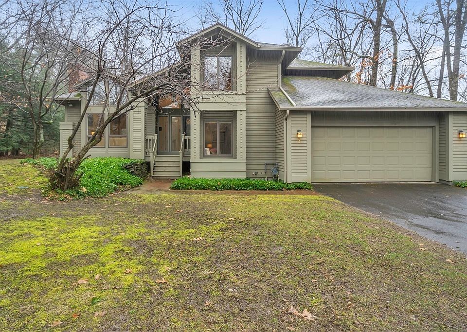 Elegant and stunning light-filled contemporary, custom-designed for family and entertaining. Host holidays in the open living/dining area with an oversized fireplace, dramatic beamed vaulted ceilings and room to seat 20. The large eat-in bespoke kitchen, renovated in 2023, overlooks the fireplaced family room. Glass doors lead to the brick patio, surrounded by a private yard with lush, mature landscaping, while a first-floor bedroom also serves as a den, office or guest room, complete with full bath. Upstairs includes an ensuite primary bedroom, two more bedrooms and another full bath. Pristine hardwood floors and tile throughout. The attached garage conveniently leads to the mudroom/laundry. A heating/AC system replacement included conversion to natural gas. Located on a quiet cul-de-sac and set back from the road, the home is just yards from the school bus stop, walking distance to hiking and biking trails, and a short drive to the vibrant cultural offerings of downtown Amherst.
