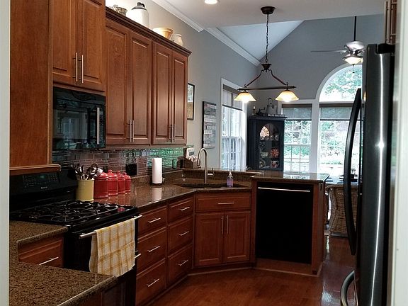 - RoomKitchenFeatures: Granite Counters, Pantry, Recessed Lighting, Fireplace, Eat-in Kitchen, Bay Window, Floors-Hardwood, Cabinets-Stained, Bar, Backsplash-Tiled