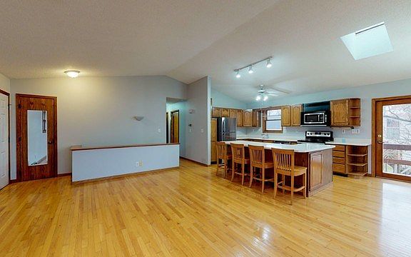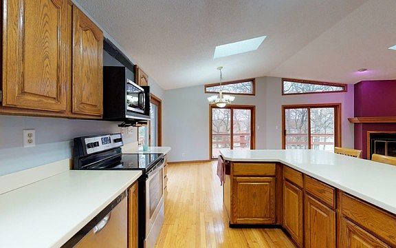 Lake Front Ranch! This custom built one family owned lake house offers a main floor open plan with fireplace, hardwood oak floors, oak cabinets and trim, as well as Corian countertops and all BRAND NEW appliances. Amazing view overlooking the private double deck made of weatherable composite right on the lake. Bright and sunny home with Pella windows that highlight the beauty of outdoors. Wrap around deck is perfect for entertaining or just sitting and relaxing. Roof and skylights brand new in 2019. Digital Hot Water Heater new in past year. Walk-out basement has two separate exits that lead right to the lake and a full bath with hot tub.