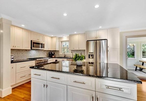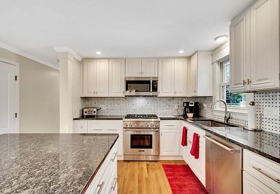 - Kit Dscrp: Flooring - Hardwood, Countertops - Stone/Granite/Solid, Kitchen Island, Stainless Steel Appliances, Recessed Lighting, Countertops - Upgraded, Remodeled, Crown Molding