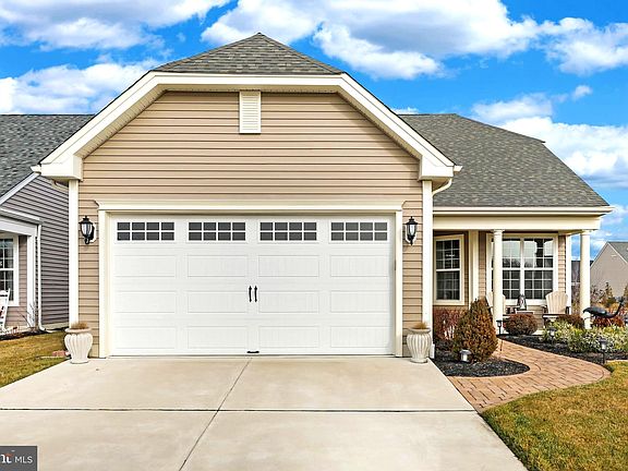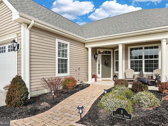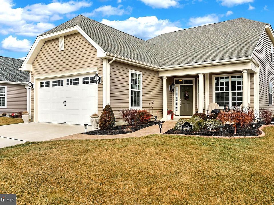 This popular Jennings style home is just 2 years young and shows like a model! Nestled on a wide corner homesite overlooking seasonal landscape as well as the Heritage park and gazebo, this home is move in ready and tastefully appointed both inside and out. A graceful winding paver walkway guides you to the pretty covered front porch. Enter a world of luxury and leisure. The foyer features a craftsman style hardwood staircase leading to a 2nd floor private loft which can also be used as a bedroom, with closet, full bath, and a large storage room with window that the owners have partially finished. Downstairs beautiful wide plank hardwood floors flow throughout the home including the 2 bedrooms, study, kitchen, dining room and gathering room. You will be proud to entertain your family and friends in the magnificent gourmet kitchen with 42" tall white cabinetry, SS GE Café appliances including a double wall oven, 5 element induction range, Sharp drawer microwave, SS vented hood over the cooktop. There is a large breakfast bar with built in sink and dishwasher boasting a waterfall quartz countertop. A stylish tile backsplash and a separate butler area with glass cabinets, custom pendant and dining lights complete this lovely kitchen which opens to the spacious dining area with pretty box window and the gathering room with 10 ft high tray ceiling, gas fireplace with remote control for flame settings; painted wood mantle, rear windows and 8 ft high sliding glass door overlooking the expanded patio and rear yard where you can extend the entertaining and relaxing outdoors. This home features a 2 ft expansion to the original design which enlarges the gathering room as well as the owner's suite and walk in closet. The Owner's Suite bathroom displays his and hers sinks, larger frameless shower with seat and tile backsplash. There is so much to love about this home. Move in now and start enjoying a renewed social life at the Heritage Clubhouse just a block away, with gaming and dining rooms, craft room, full gym room, outdoor pool and spa, pickle ball court and bocce courts. There are community walking paths around several ponds. The Association maintains the common areas as well as your lawn care including the mowing and fertilization and snow removal freeing you to celebrate all the great things the Active Adult lifestyle has to offer in a convenient setting. Heritage is within walking distance to the Acme supermarket complex, with grocery shopping, banking, restaurants, ups store, and more.