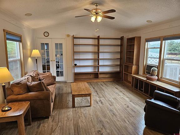 This generously fenced-in yard is a haven for green thumbs and outdoor enthusiasts alike. Inside, the spacious 1,216 square feet offer plenty of room for you to personalize and call your own. The open-floor plan seamlessly connects the living, dining, and kitchen areas. With 3 bedrooms, there's ample space for everyone to find their sanctuary. The master bedroom features an en-suite bathroom, ensuring your comfort and privacy. Some updates have been thoughtfully incorporated, adding a touch of modernity to this cozy haven. Beyond the walls of your new abode, the Regency mobile home park offers a sense of community, set in splendor of the Animas Valley, the views from the garden and front room of the beuatiful red cliffs, are an envy of the neighbors, being close to the entrance of the park is not only convient but you have an unobstructed view of the cliffs. If you've been searching for an affordable option in La Plata county, where the beauty of a flourishing garden and the space you need to call home, then this is the one for you. Lot rent $725 per month which includes water, sewer, trash pickup, and snow removal. Contact us today to arrange a private tour.