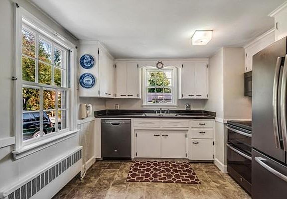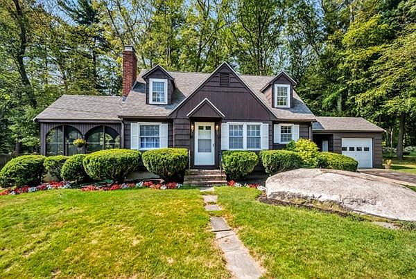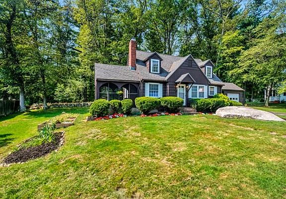 Storybook Cape in great location on ended way. Spacious Living Room with hardwoods, cozy fireplace and built-in shelving for your favorite books. Nice size formal Dining Room with wood floors and new light fixture. Kitchen features newer appliances including double oven, and ample counter space/cabinets. Main level bedroom and full bath with tub and shower complete the first floor. Upstairs is a huge Master bedroom with 1/2 bath, additional bedroom with sitting area at top of stairway. Hardwoods throughout most of the house. Kitchen side entry leads to covered walkway and 1 car detached garage! Screened Porch off Living Room is fantastic! Enjoy these late summer/autumn evenings and the views of gorgeous gardens around the home. Newer Septic System. Full basement with tons of storage space. Close proximity to commuter rail and highway access!