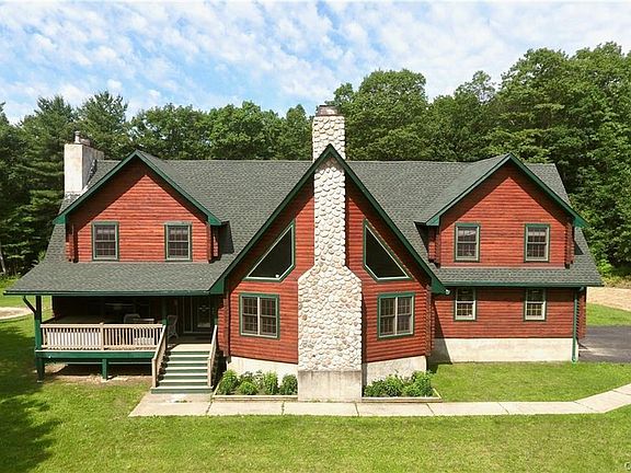 Magnificent Custom Log Estate privately nestled on 18 acres in the Minisink Valley School District! Beamed ceilings, gleaming hard wood floors & rustic details throughout is just the beginning! The first floor offers a formal dining room, half bath,& family room with stone fire place perfect for warming up on snowy nights! Large eat in kitchen complete with granite countertops, island cooktop, dual wall oven & pantry. Lastly a living room with an impressive cathedral ceiling & wood burning stove surrounded by stone, perfect for entertaining! On the second level you are greeted by an open hallway looking down to the first floor, 3 large bedrooms a full hall bath plus a master suite complete with a spa worthy ensuite & private balcony! Spray foam insulation,50 year roof under 5 years old, 3 forms of heating, & the entire exterior just refinished!Quad trails, hiking, hunting & privacy this property has it all! Conveniently located just minutes to Metro North station!