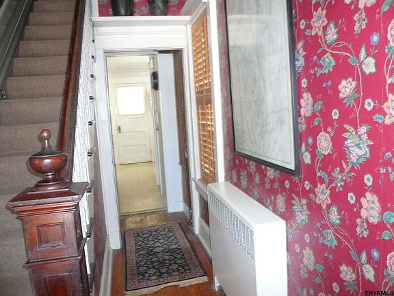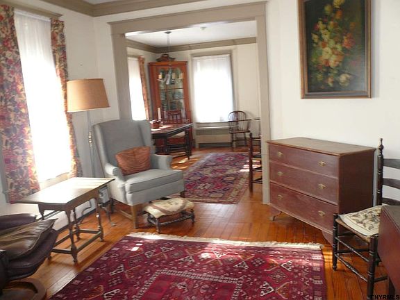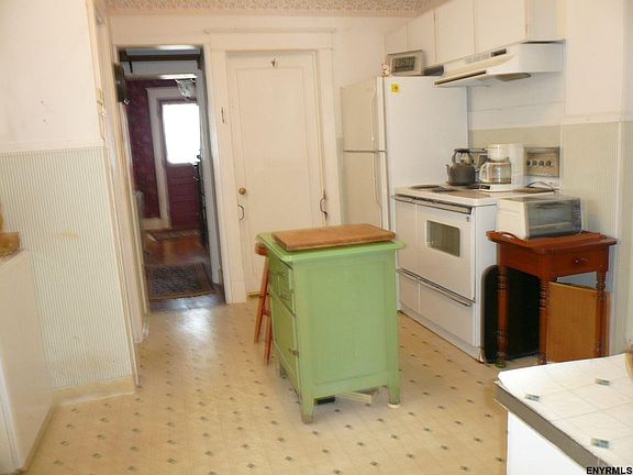This is a wonderful solid side hall colonial in need of updating. The first floor has a large mud room with lots of closet space, an old style kitchen with built in cabinets , 1/2 bath, formal living room and dining room. Beautiful wood floors, high ceilings, nice moldings..,.. the second floor has two large and one small bedroom and a full bath. Slate roof on the house, oil baseboard heat. Out back is a large block two story barn with a 3 bay garage. Walk around the corner to all village activities,.