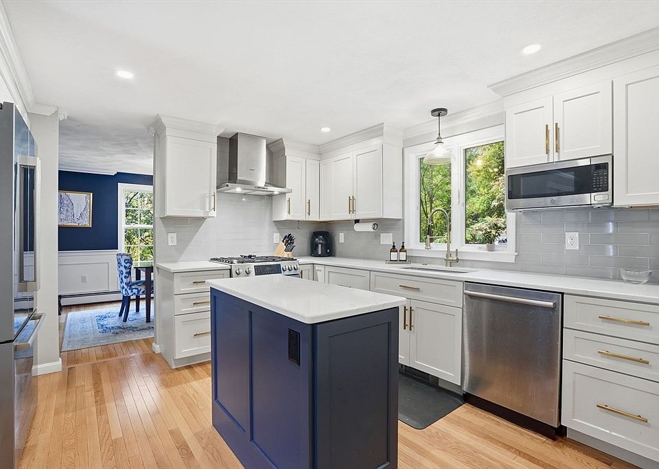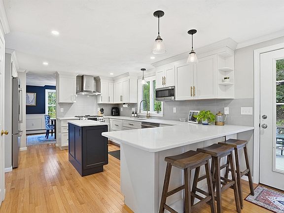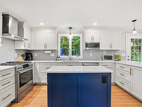 Truly a magnificient & updated property with 2 attached garage parking spaces, all located in quiet cul-de-sac where homes are so rarely available. Main living level offers fully modern and recently renovated kitchen w/ breakfast bar, open to living room w/ fireplace. Dining room w/ bay windows adjacent to addl den / office space plus convenient 1/2 bath & main living level laundry. 2nd floor offers 3 spacious bedrooms, each w/ large closets. Full shared bathroom on this floor for kids/guests. Primary bedroom has custom walk-in closet & ensuite bath w/ double vanity & walk-in shower. Third floor w/ amazing ceiling height & skylights serves as playroom, addl tv room/office/bedroom. Private back yard w/ mature trees & spacious, tiered deck, perfect for entertaining. Loads of storage and bonus workshop area. Outdoor enthusiasts will love nearby Spot Pond, Tri-Community Greenway & Fells Reservation. Convenient to restaurants/shops & a commuter's dream location!