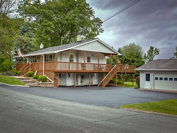 This ranch style home offers landscaped paver walk way, covered front porch, 2 bedrooms with the potential for a 3rd bedroom, 2 full baths, large living room, formal dining room, updated kitchen with granite counter tops and tiled back splash, hardwood floors throughout main level, and lower level family room with new propane heating stove. For your outdoor enjoyment a large back deck overlooking landscaped yard with in ground pool, outdoor fireplace and storage shed. Plus a 2 car detached garage with enclosed porch with pool changing area. Conveniently located to NYS Thruway or Route 84 for easy commuting. Valley Central Schools District