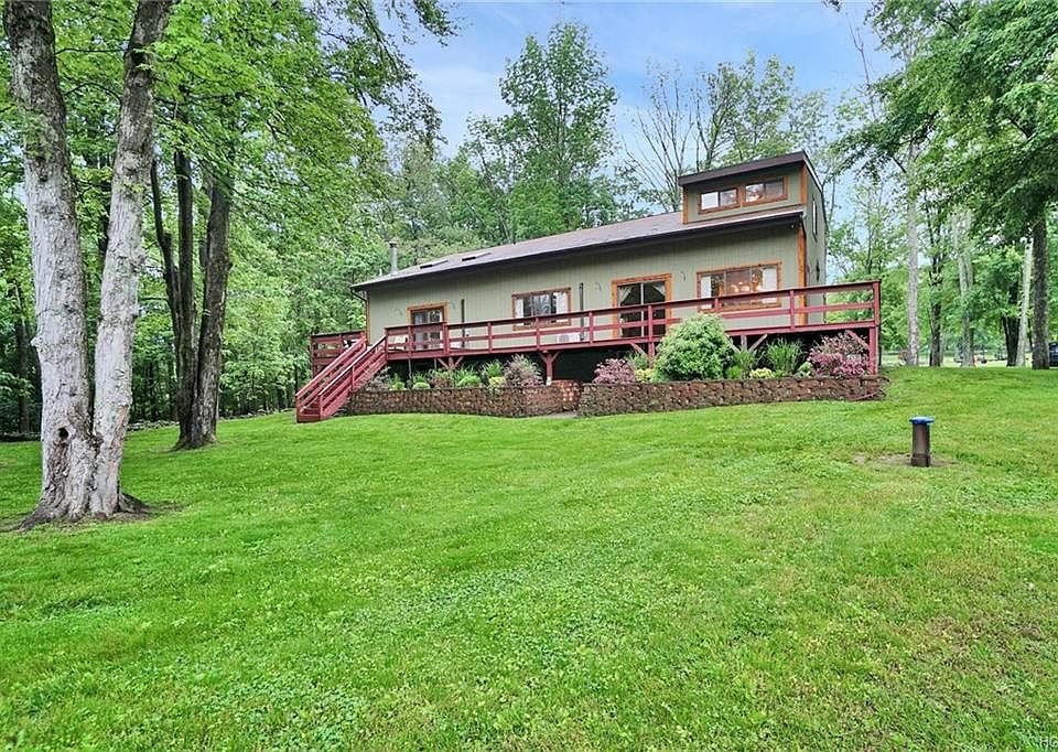 The perfect blend of contemporary style,spacious floorplan and thought filled upgrades are found in this unique home in a desired cul de sac in the Minisink Valley school district!Privacy meets a neighborhood setting and curb appeal is enhanced by wrap around deck overlooking rock wall,professional landscaping and stone work.Kitchen renovation was just completed and offers new stainless appliances,granite countertop,sleek cabinets and tile backsplash.Skylights and woodburning stove warm the family room and vaulted ceilings add a modern touch to over 2400 square feet of living space.Master suite is impressive with beautiful new bathroom with duo sinks and custom walk in closet.First floor bedroom has direct access to full bath for comfortable guest accommodations and two additional bedrooms and third bath are found upstairs.Exterior freshly painted,new driveway,two car garage,shed and basement for storage or work shop.Low taxes and minutes to train,town park and highways.
