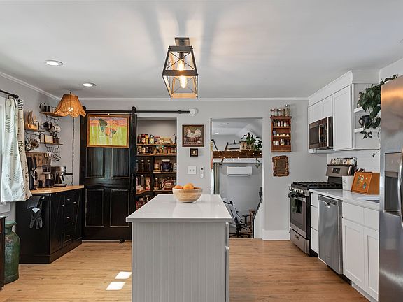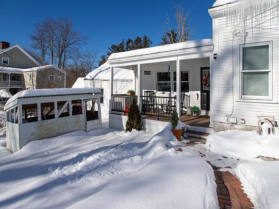 Set on a sunny corner lot spanning .63 acres, this storybook Cape is filled with beautiful natural light and offers the perfect blend of antique charm and thoughtful modern updates. A welcoming front porch sets the tone—ideal for slow mornings with coffee and peaceful evenings taking it all in. Inside, the front foyer showcases natural woodwork, crown moldings, and warm laminate floors, highlighting the home’s classic character while maintaining a fresh, updated feel. To the right is the first-floor primary suite, and to the left, a cozy dining room anchored by a new pellet stove with a beautiful mantel, providing year-round comfort. The primary bedroom features a decorative fireplace, walk-in closet, and a stylish ¾ bath with tile and modern fixtures. The updated kitchen shines with quartz countertops, wainscoting, crown detail, and a custom accent wall with hooks, along with a coffee bar, walk-in pantry with sliding barn door, and newer stainless steel appliances. The sink overlooks the backyard, and the space flows effortlessly into a sun-filled, sunken family room—perfect for relaxing or working from home—complete with a mini-split and direct access outside. A first-floor laundry area with oversized machines and counter space adds everyday convenience. Upstairs offers two charming bedrooms, a versatile flex landing space currently used as a family room/workout area (with potential for a guest room or additional bedroom), and a fully updated bath with tub. Outdoors, enjoy a thoughtfully curated yard with raised garden beds, apple & pear trees, 3 yr roof a chicken coop, and a new storage shed. Owner updates include a mini-split, accent walls and wainscoting, granite steps and walkway, additional parking, fresh paint, new plantings, and more. Just minutes from skiing, hiking, and Goffstown’s shops & amenities, this beautifully updated home offers timeless charm, everyday convenience, and true move-in-ready ease—a rare and special find. Open House Sat 11-1PM