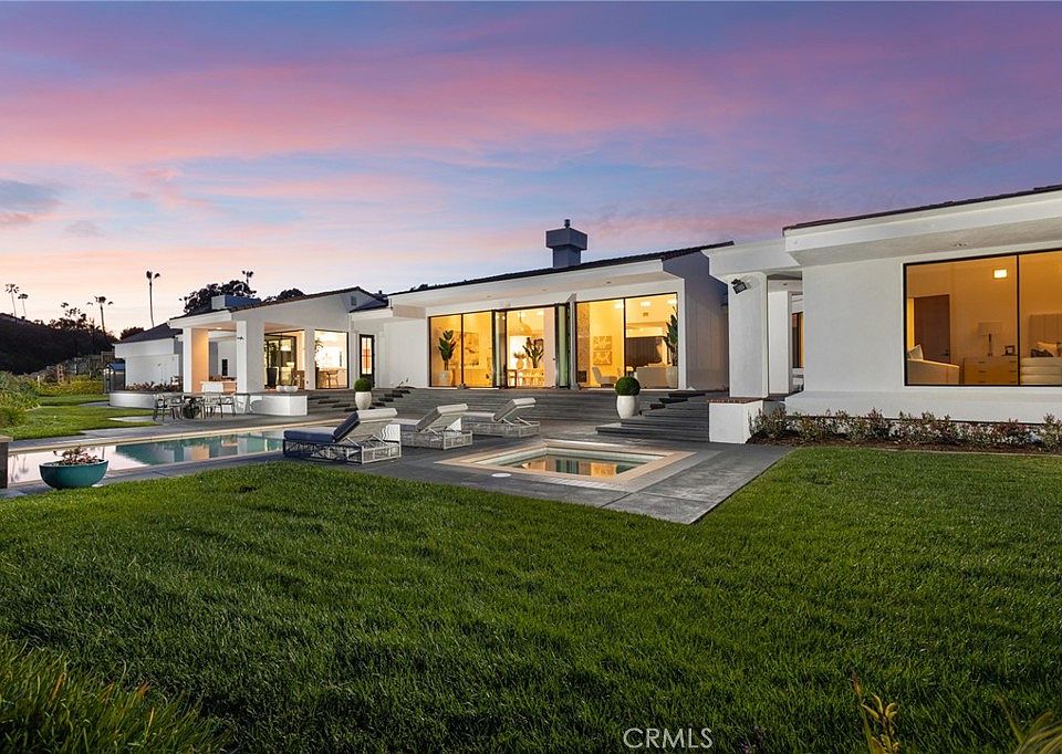Occupying one of the most desirable estate-sized homesites in Laguna Niguel’s guard-gated Bear Brand Ranch community, this newly remodeled custom contemporary residence boasts panoramic ocean, valley, hillside, and city-light views. The expansive single-level design extends approximately 5,786 square feet and presents four ensuite bedrooms and four-and-one-half baths on sprawling grounds that include a completely redone pool, and spa. Incorporating high ceilings, clerestory windows, picture windows, and skylights, the reimagined design creates an extra-bright and inviting ambiance throughout. Double doors open to reveal a grand foyer and lead to the living and dining areas where a magnificent floor-to-ceiling fireplace, adorned by new stone surrounds, provides the perfect centerpiece for the space. Walls of windows and accordion glass sliding doors bring the outdoors in and frame the panoramic backyard views. A butler’s pantry and oversized laundry/storage room leads the way to a custom chef’s kitchen with a massive island, secondary butcher-block island, ocean-view breakfast room with patio access, open shelving, white Shaker cabinetry, quartz countertops, a farmhouse-style sink, Wolf six-burner stove, and built-in beverage refrigerator. The great room features a walk-in wet bar and cozy fireplace, creating an ideal place for fun-filled gatherings. Additional highlights include under-lit floating vanities in the remodeled baths and a custom mudroom. The primary suite, located in its own private wing, boasts sweeping views, patio access, two walk-in closets (including one with a washer and dryer), and a luxurious walk-in shower enclosing a freestanding tub. Completing the residence are two two-car garages and a versatile detached bonus space could easily function as an additional office, theater, play room, or casita. The stunning outdoor space spans approximately 37,950 square feet and includes a gated circular driveway, covered entry portico, lush lawns, covered and sun patios, pool, and spa. With easy access to Dana Point Harbor, beaches, award-winning schools, trails, recreation, parks, and shopping centers, this home is truly magnificent and offers the ultimate in Southern California living.