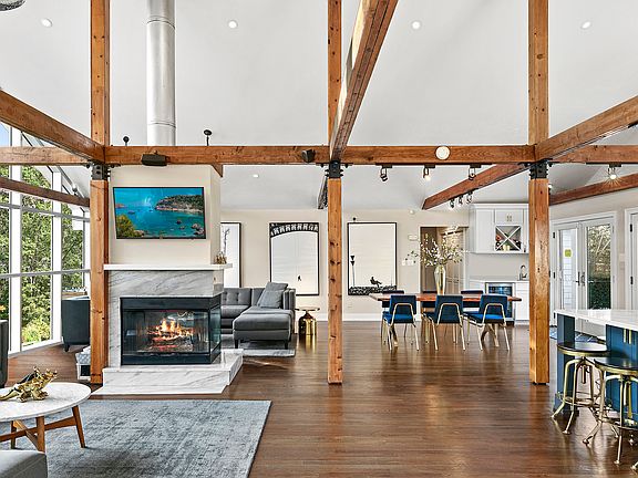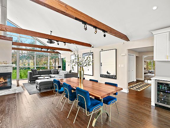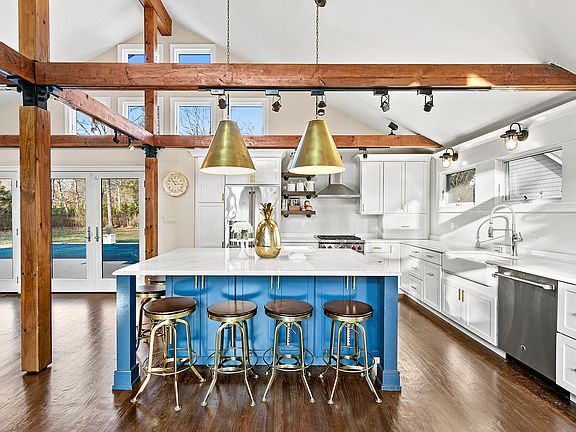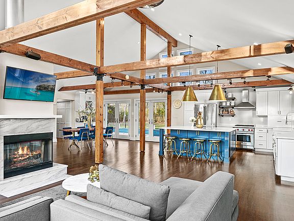 Rental Registration #: RP250286 Renovated top to bottom in 2017, this 4-bedroom, 3.5-bath is your ideal summer escape! Classic meets contemporary in the modern post and beam great room, with floor to ceiling windows, accented by natural wood, modern, industrial finishes, and pops of ocean blue. The chef's kitchen with high-end appliances is centered around the quartz-countered island, with seating for 8, and open to the dining area, with wet bar and beverage fridge, and sitting areas surrounding the double-sided wood-burning fireplace. The master suite offers two full bathrooms, one with a double vanity and deep soaking tub. The adjacent bunk room, reminiscent of summer camp, offers sleeping for 6. Two additional guest bedrooms share a joined bathroom. Standout amenities include expansive outdoor living and entertaining space, a heated pool, outdoor shower, Weber grill, and ample lawn on the 1-acre property. Vibrant WHB Village is approximately 2 miles away and Dune Road, 3 miles. Close proximity to the Jitney, LIRR, and highway make travel to and from quite convenient.
