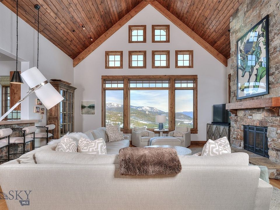 Enjoy panoramic views of Wilson Peak, Spanish Peaks, Gallatin Range & Big Sky Resort from this ski in ski out residence located in the heart of Moonlight Basin. The vaulted ceilings with ample windows provide for a bright and spacious setting, while still feeling cozy with warm wood tones and stone fireplaces in the great room and master bedroom. Take in views of the expansive mountain ranges, including Lone Peak, while relaxing in the hot tub next to the wood burning fireplace on the large, covered deck. Main level features an open concept living-kitchen-dining room, powder bathroom, laundry closet, master bedroom and two guest rooms, all with ensuite bathrooms. The upper level includes a loft, currently set up as a second living area, two additional bedrooms and a full bathroom. An elevator makes it effortless to head to the lower-level heated garage where you'll find easy ski in ski out access. Option to purchase a Moonlight Sport or Golf Membership available with Club approval.