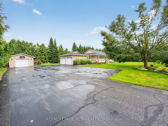 Welcome Home to Hawkstone. This Beautifully Upgraded and Impeccably Maintained One Acre Bungalow Property Sits Nestled in a Warm and Inviting Community Where Neighbours Know Neighbours. The 3 Bedroom Home Features a Factory Painted and Treated Wood Composite Exterior, a Wrap Around Porch that Transitions to a Rear Deck with Hot Tub, Ample Seating, BBQ and Meal Prep Area, Dining Areas, and Beautiful Gardens. The Bright Kitchen Features Black Stainless Steel Appliances, Granite Counters, Loads of Natural Light as well as Ample Storage and Space to Create Culinary Masterpieces. The Primary Bedroom Features a Built In King Size Bed, Dresser and Bedside Tables, an Ensuite that Also Houses the Washer and Dryer and His and Her Closets. Two of the Main Floor Bedrooms are Currently Used for a Sewing Room and an Office so Possibilities Abound. Don't cram the Two Car Garage with Everything you need to Store - because also on the Property is a Large Garden Shed and a Gas Heated Man Cave Workshop/Extra Garage with Garage Door and Man Door. Room to Host Large Gatherings with enough Driveway Space for 20 Vehicles. The Basement Showcases a Rec Room with a Gas Fireplace, Built in Speakers and 3D TV, another Bedroom, and a Flex Space with a Murphy Bed. The Bathroom doesn't just have the basics - Enjoy a 8 x10 foot Sauna Fin Cedar Sauna to Melt Your Cares Away and the Obvious Health Benefits.