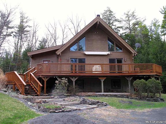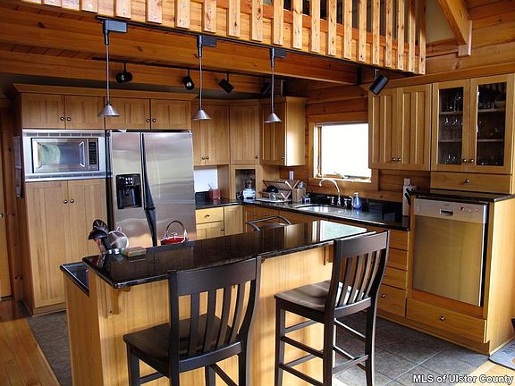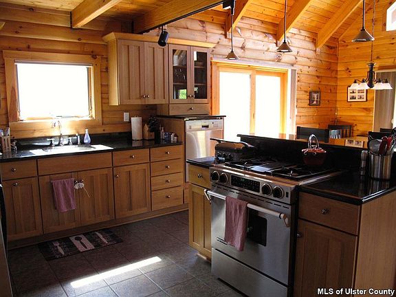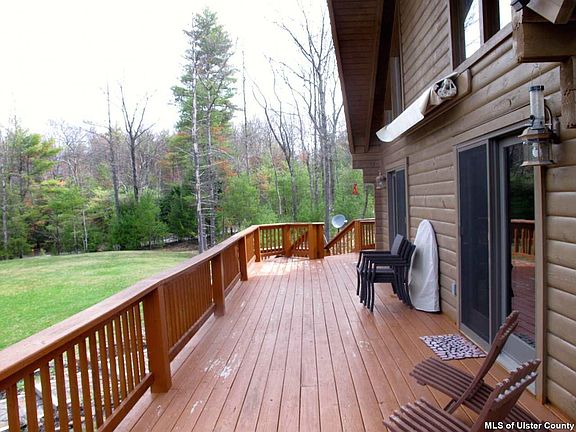 This sophisticated Woodstock-area log home enjoys complete seclusion and, especially, Hurley low taxes, conveniently located as well to the Thruway. Current relocating owners have maintained it beautifully and renovated both bathrooms as well as adding central air. Enjoy the stone fireplace in the great room and chat back and forth to the cook's kitchen. In the warm weather have complete privacy on the generous decking. Full basement can easily be finished and already has a wood stove. Master suite on the second floor is separated from the downstairs bedrooms. Would make a sensational second home, which it has been, or a full-time residence. A gem amidst the current sluggish inventory.