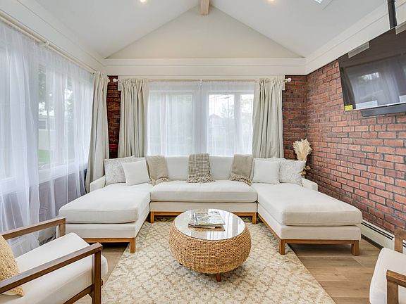 sq. ft. of living space on 2 levels. Interiors are bright and welcoming, with natural light streaming into the main living areas. The living room is anchored by a gas fireplace, setting the tone for cozy evenings or laid-back gatherings. A dedicated dining room with large sliding glass door makes entertaining seamless, while a separate media den with exposed brick adds texture and charm. An open home office nook sits just off the main stair, offering a quiet place to work or read. On the finished walkout lower level, you'll find a second living room and three additional bedrooms-including a bunk room-along with 2 full baths, wet bar and media room, offering the perfect arrangement for guests or multi-generational living. The large deck space includes an outdoor kitchenette with grill and fridge, easily accessible from the living area for easy indoor-outdoor living and entertaining. Outdoors, the allure continues with direct access to a quiet private beach, a rare luxury that makes this property ideal for paddleboarding, kayaking, or simply soaking in the sunsets over the bay. Set in a discreet and tranquil location, yet conveniently positioned for enjoying all the Hamptons has to offer, this well-appointed home is a compelling rental offering for any season. Whether you're planning a long summer stay or a short-term visit for a major event, this is coastal living at its most comfortable and refined.