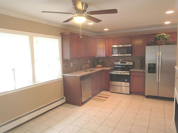 A totally remodeled expanded ranch (Levittowner) with 4 bedrooms, 2 baths and Open Floor Plan is just what you've been looking for. Enter into the front door and be amazed by the quality upgrades the Seller has done. Kitchen features lots of chestnut wood shaker cabinets, tile back splash with glass inlay, granite counter tops with drop in stainless steel sink and pullout faucet, recessed lights, ceramic tile flooring and new Amana stainless steel pkg with side by side refrig with ice and water n door, glass top oven and built in microwave and dishwasher. Seller has removed wall between kitchen and Living room to give open floor plan for easy entertaining. Dining area with ceramic tile floors, 2 double hung windows for lots of natural lighting and ceiling fan. Vestibule has been removed to increase eating space. Living room with laminate floors, 2 sided fireplace with marble accent, ceiling fan and recess lights. Large vinyl bay window for added natural lighting. Addition on rear of house features private main bedroom featuring w/w carpeting, ceiling fan and recessed lighting, full bath has been added and features shower stall with ceramic tile walls and glass inlay, ceramic wood look floor, dual flush toilet, wood vanity with mirror medicine cabinet and washer/dryer hookup. Original portion of home features 3 bedrooms with new w/w carpet and ceiling fan, remodeled hall bath with tub with ceramic tile walls with glass inlay, ceramic tile floor.dual flush toilet and wood vanity with medicine cabinet. Exterior features replaced 3 dimensional roof and windows, maintenance free vinyl siding, two car macadam driveway, front cement patio, fenced in rear yard with recently painted wood deck. Extras include attached on e car garage featuring rear workshop with bench and storage above, replaced Thermotron II heater that has been relocated to rear of garage, 2-zone hot water baseboard heat, newer 200-amp circuit breaker system, freshly painted interior with 6 panel doors and crown molding throughout, newer front fiberglass wood look door with leaded glass and outside exterior lighting. This home is FHA/VA approved, making for an affordable down payment. Close to schools, major roads, bridges and public transportation. Available for quick settlement! Just bring the moving truck and unpack!!! Put this one on your list! Won't last!!