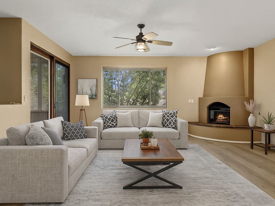 Privately positioned at the end of a cul-de-sac in Rancho Viejo, 3 Periwinkle Place offers a comfortable single-level layout with 3 bedrooms and 2 bathrooms, thoughtfully designed with separation in mind. The primary suite and two guest bedrooms are located on opposite sides of the home, creating a sense of privacy and flexibility. This approximately 1,846 square foot home features a gas kiva fireplace at the heart of a spacious kitchen and living area, providing a warm and open gathering space. Radiant in-floor heating and evaporative cooling ensure year-round comfort. Brand new carpet has been installed throughout the whole house, enhancing its fresh and inviting feel. Sliding doors open to a catio, offering a protected outdoor area for pets or quiet relaxation. The home sits adjacent to a landscaped open greenbelt, offering a calm and natural backdrop. The outdoor areas include mature landscaping, a drip irrigation system, and a covered patio designed for low-maintenance enjoyment. The layout supports both day-to-day ease and comfortable hosting. Recent upgrades completed in 2023 include a new boiler, new water heater, and a new roof, providing added value and peace of mind. Additional features include a two-car garage, underground utilities, and convenient access to nearby schools, restaurants, and I-25. Buyers are encouraged to verify square footage, lot size, and all features to their own satisfaction.