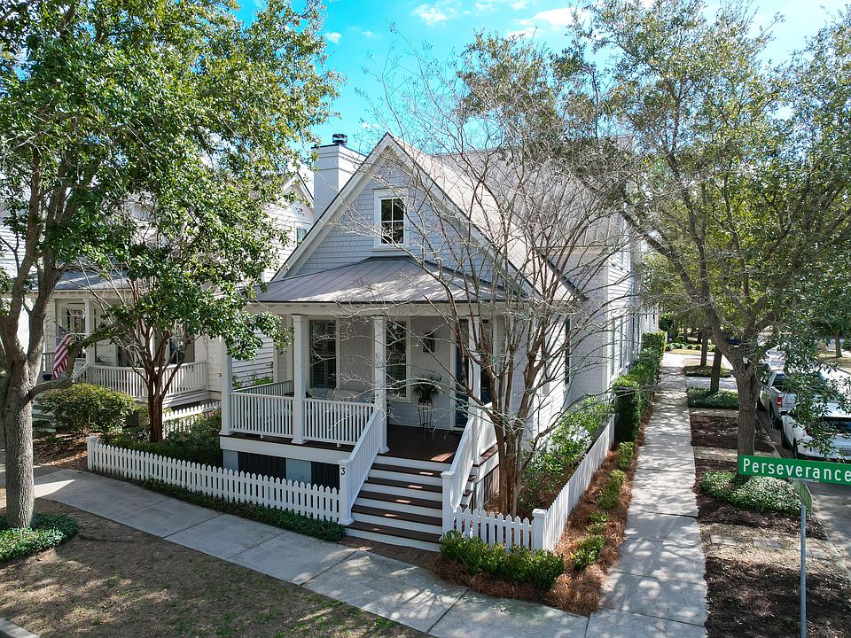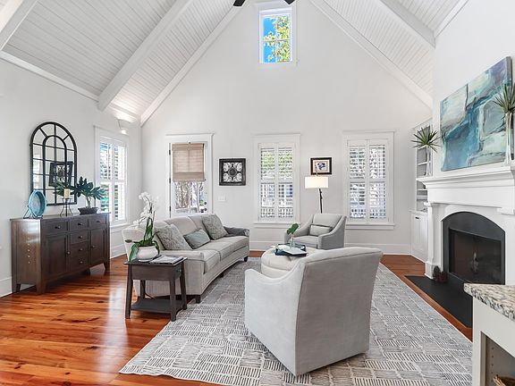 A beautifully planned cottage which lives large crafted by premier I'on builder, Jack Burton. One of the best open floor plans includes a primary bedroom on the main level and a detached guest house added in 2021. Situated on a quiet corner lot within walking distance to Maybank Green and Westlake Parks, this home exudes charm and sophistication with a welcoming full front porch, exterior shake shingles and metal roof. Be wowed upon entering enormous beamed and cathedral ceilings in living room with fireplace flanked by bookcases and open to large gourmet kitchen and dining area. Gleaming wood floors throughout and light filled windows plus primary bedroom with luxury bath and large walk in closet make this home unique. A total of 4 bedrooms and 3 1/2 baths includes the guest housewith 284 sq ft bedroom and full bath. The cook's kitchen with custom cabinetry has a large island with gas cooktop and bar seating overlooking a generous dining area perfect for entertaining a large crowd. A mudroom with built in storage and separate laundry is conveniently located adjacent to the kitchen with access to the rear screened porch. A lovely powder room is located near the staircase to second floor. This floor has a large landing perfect for a reading area. An enormous bonus, media or office area is to the right of the landing. A full marble bath services the two guest rooms making a total of 3 full bedrooms in the main house. In addition, there is a linen closet for storage between the two guest rooms. Head out to the patio area perfect for large gatherings with an extra parking space behind the detached garage and guest house. An architectural curved staircase leads to the beautifully appointed guest house which includes a large bedroom, built in book cases and full marble bath.
