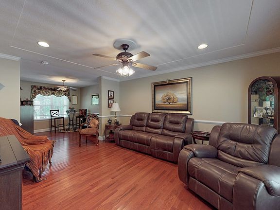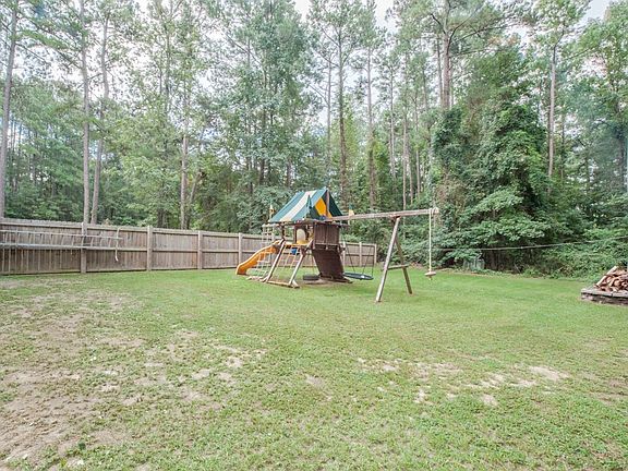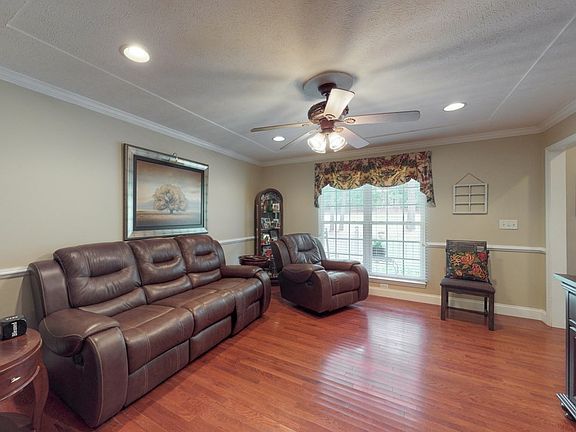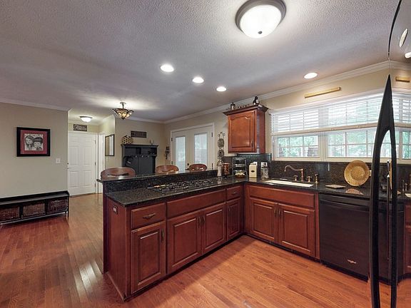 All brick 1.34 acres 4 bedrm 2.5 baths with rear entry 2 car garage & awesome neighborhood pond for fishing! Level yard perfect for a pool! Remove trees if want to add workshop! Newer architectural shingle roof, hot water heater & upstairs hvac! Rocking chair front porch! Hardwood floors! Kitchen with granite counter tops, pantry, breakfast bar, built in microwave, newer gas stove & dishwasher & refrigerator! Huge dining rm with gas fireplace or would also make great den or office! Separate space off living rm was originally the dining rm, would make great game table area! Living rm with awesome ceiling treatment & chair rail! Owners suite with 1 walk in closet plus 2nd closet, tray ceiling, fan, bath with granite counter top, tile shower & jetted tub! Spacious spare bedrms with fans! Bathrm with upgraded granite top, tile floor & jetted tub/shower combo! 4th bedrm or bonus rm with wood floors! Covered back porch! Fire pit! 2 inch blinds! $2000 flooring allowance!